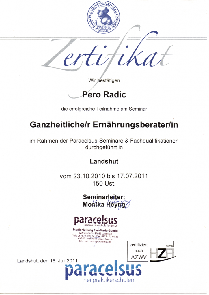 Mein Name ist Pero Radic und ich habe beim Paracelsus Heilpraktikerschulen den ganzheitlichen Ernährungsberater absolviert und beim Institut Vitamin Delta meine ärztliche geprüfte Ausbildung zum Vitamin D Berater abgeschlossen.